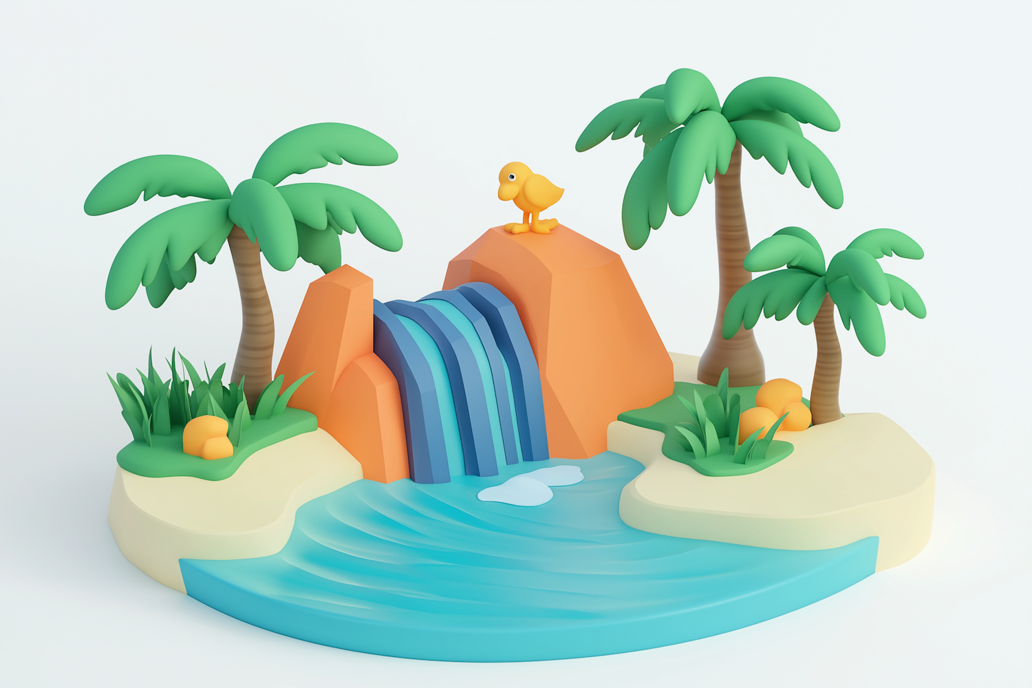 Whimsical 3D tropical island scene with a waterfall, palm trees, and a cute yellow bird. Bright colors and playful design.