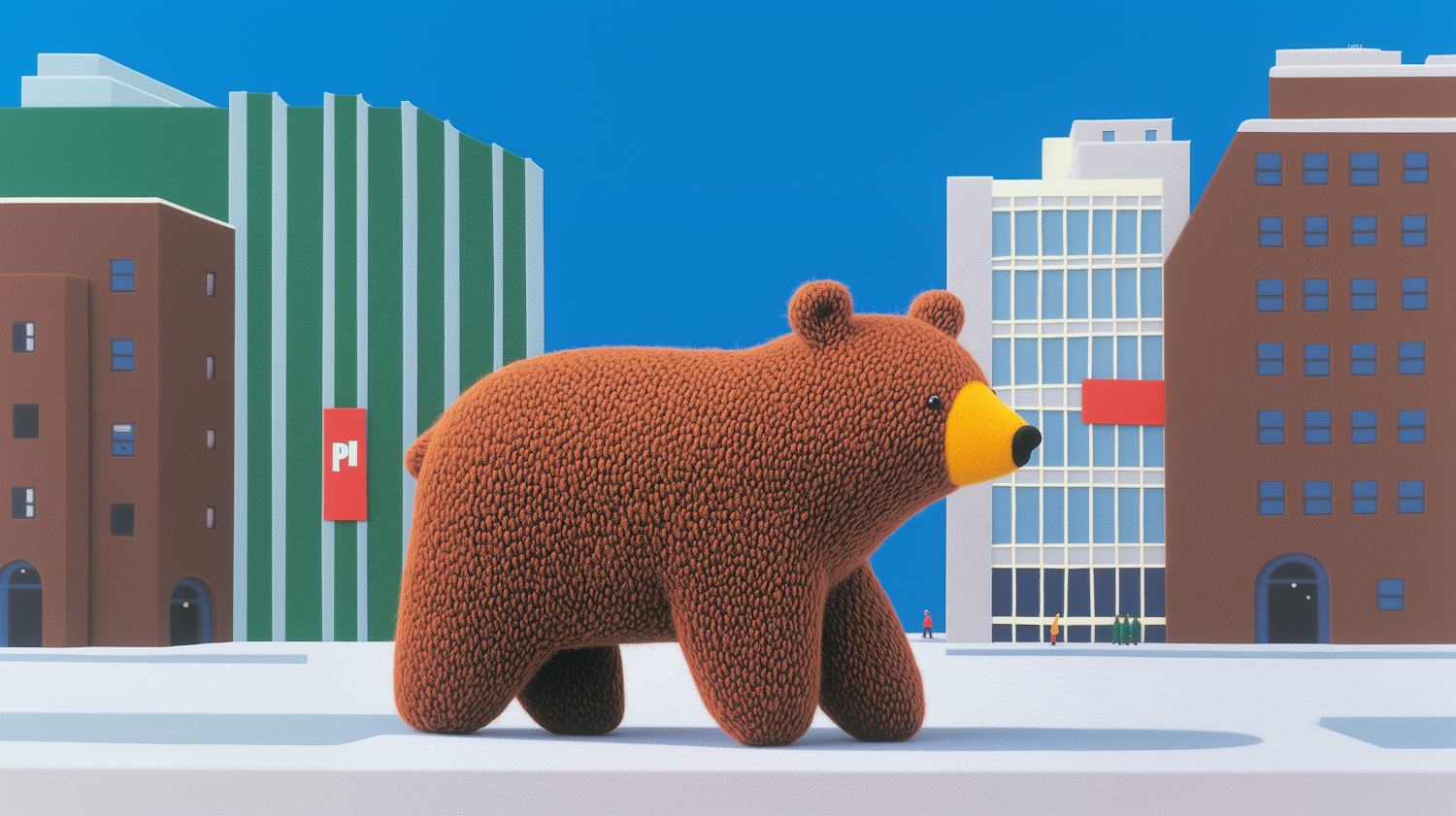 A whimsical plush bear walks through a stylized cityscape with colorful buildings and a bright blue sky.