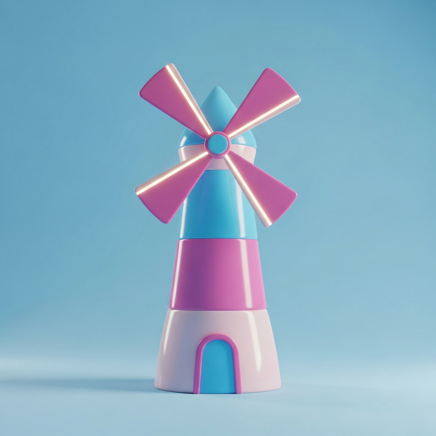 A colorful 3D-rendered windmill with pastel pink and blue tones, set against a light blue background, creating a playful and modern look.
