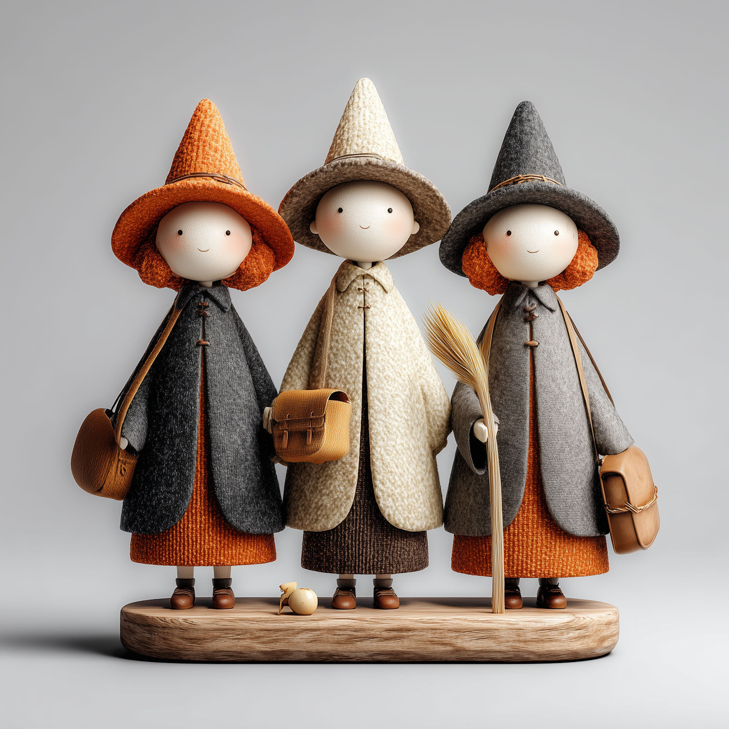 Three whimsical witch figurines with orange hair and textured outfits stand on a wooden base, holding accessories like bags and a broomstick.