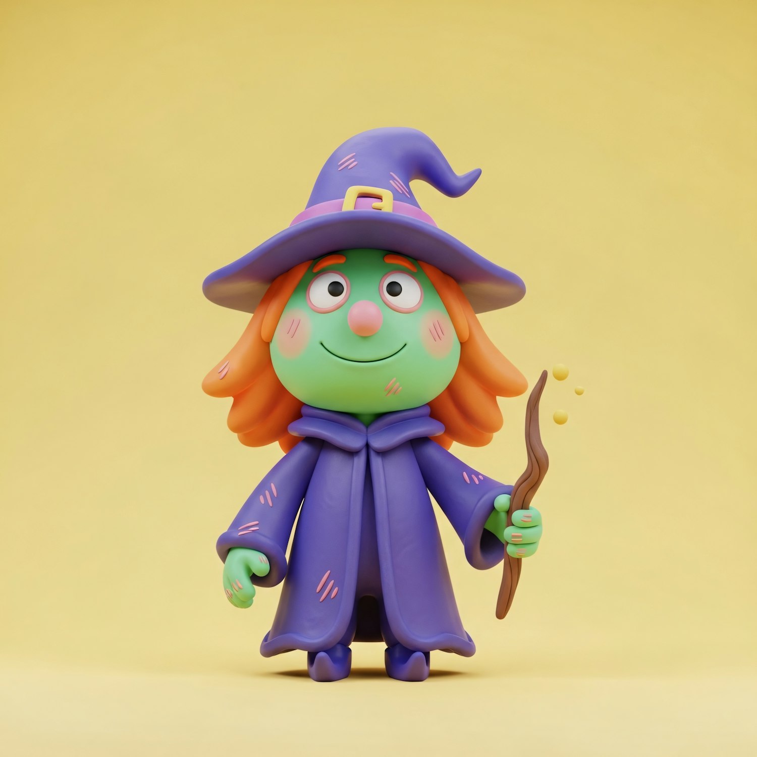 A cute cartoon witch with green skin, orange hair, and a purple outfit holding a wand, set against a yellow background.