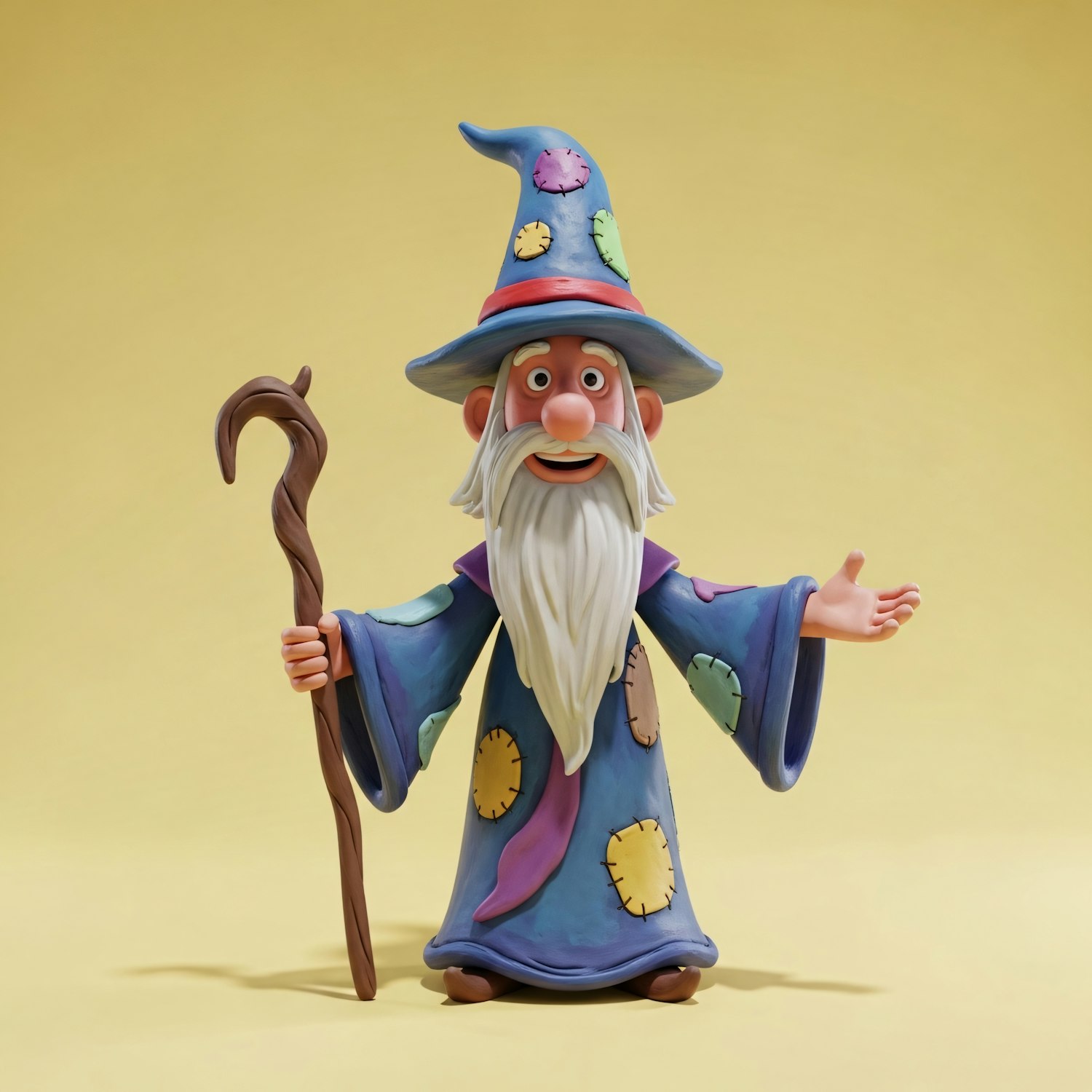 A cheerful cartoon wizard with a patchwork robe and hat, holding a staff, set against a light yellow background.