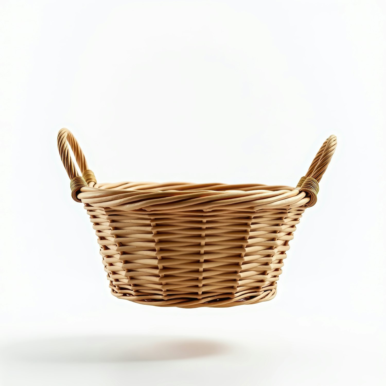 Elegant wicker basket with handles, floating against a white background, showcasing intricate weaving and natural tones.
