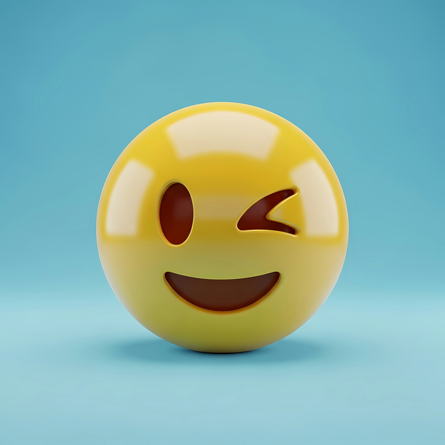 3D-rendered winking emoji with a bright yellow surface and a cheerful expression on a light blue background.