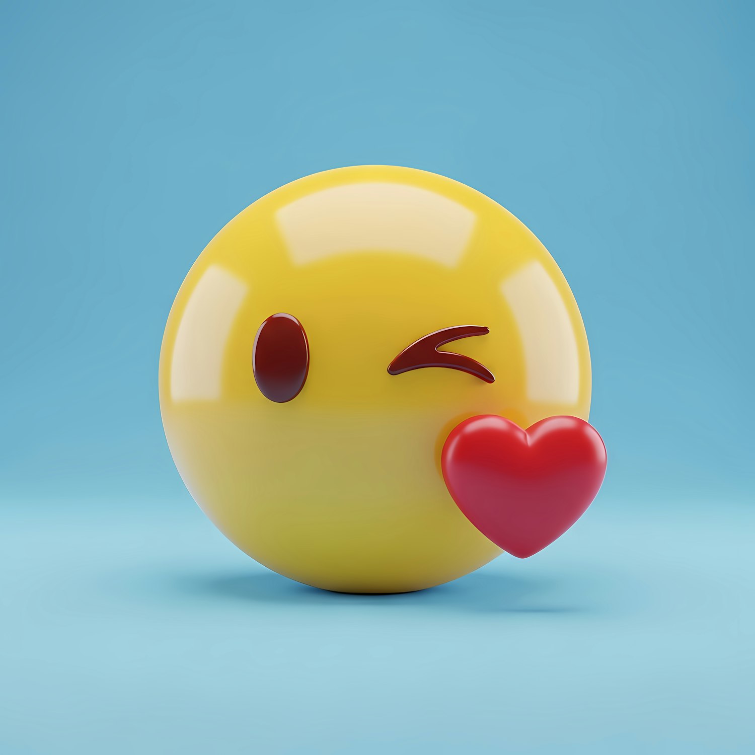 3D emoji with a winking face and a red heart on its cheek, set against a light blue background. Fun and playful design.