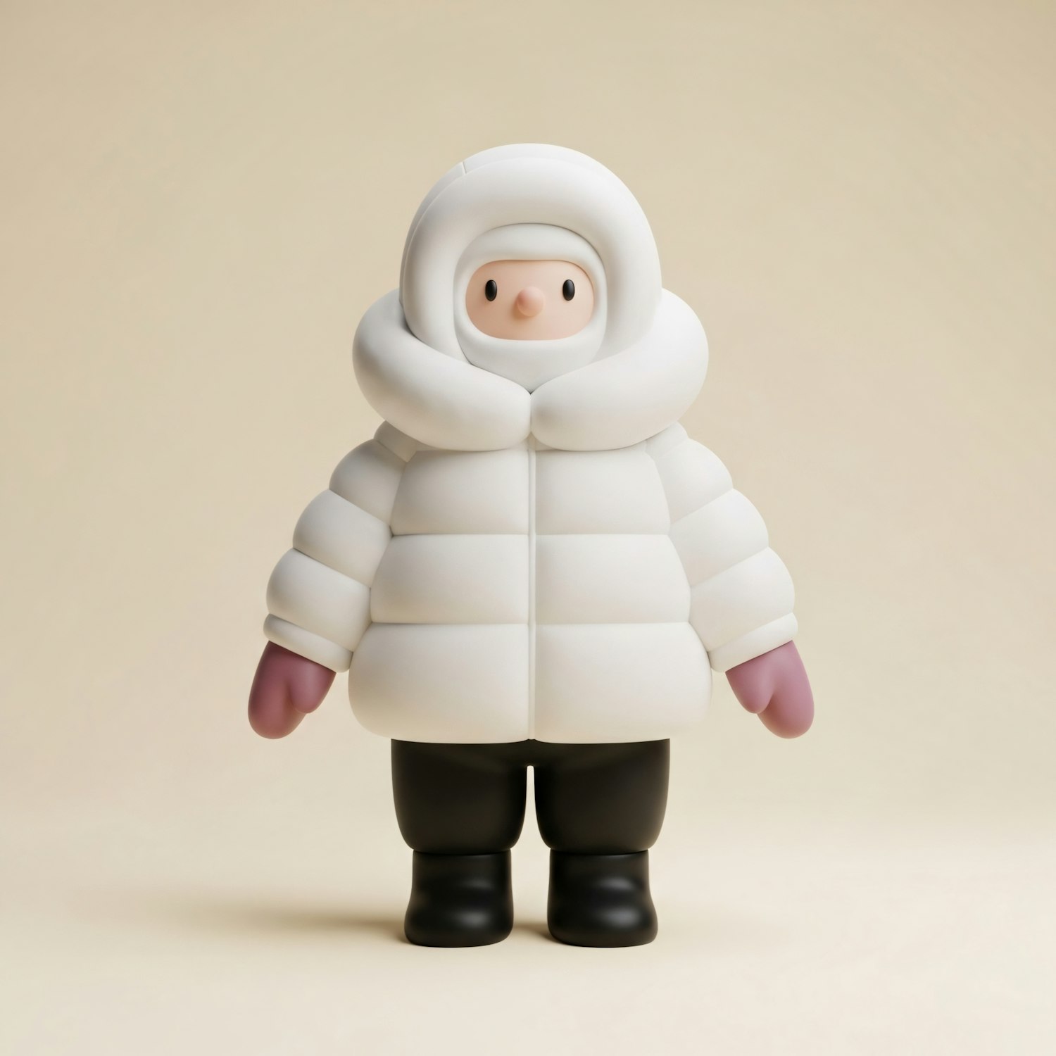 A cute, minimalistic figure in a white puffy jacket, purple gloves, and black boots, set against a neutral beige background.