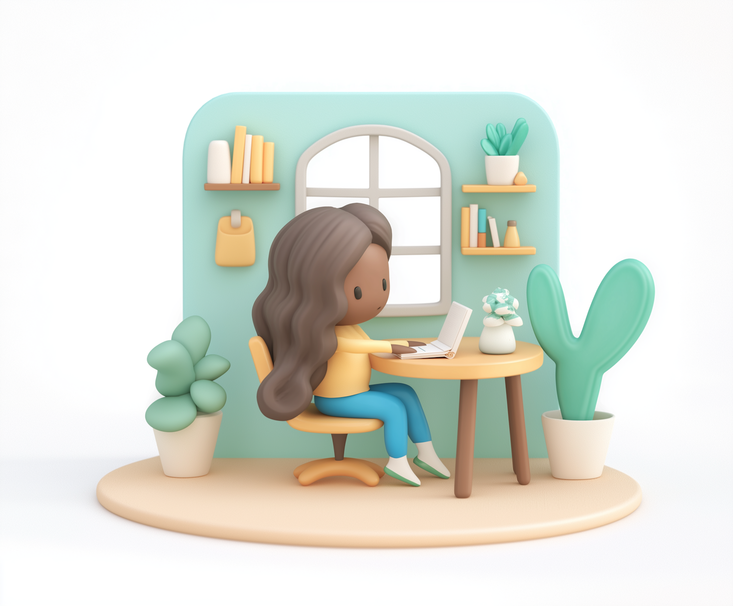 Charming illustration of a cozy workspace with a cartoon character working on a laptop, surrounded by plants and pastel decor.