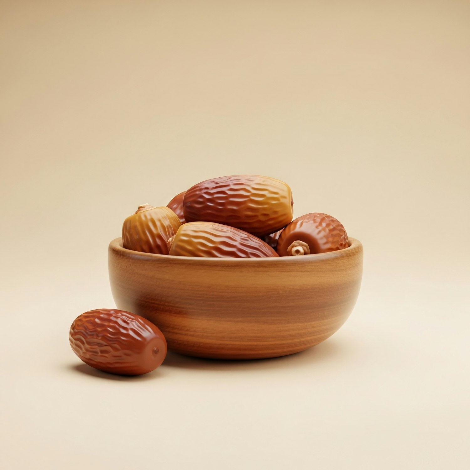 A wooden bowl filled with glossy, textured dates on a beige background, showcasing natural tones and a minimalistic aesthetic.