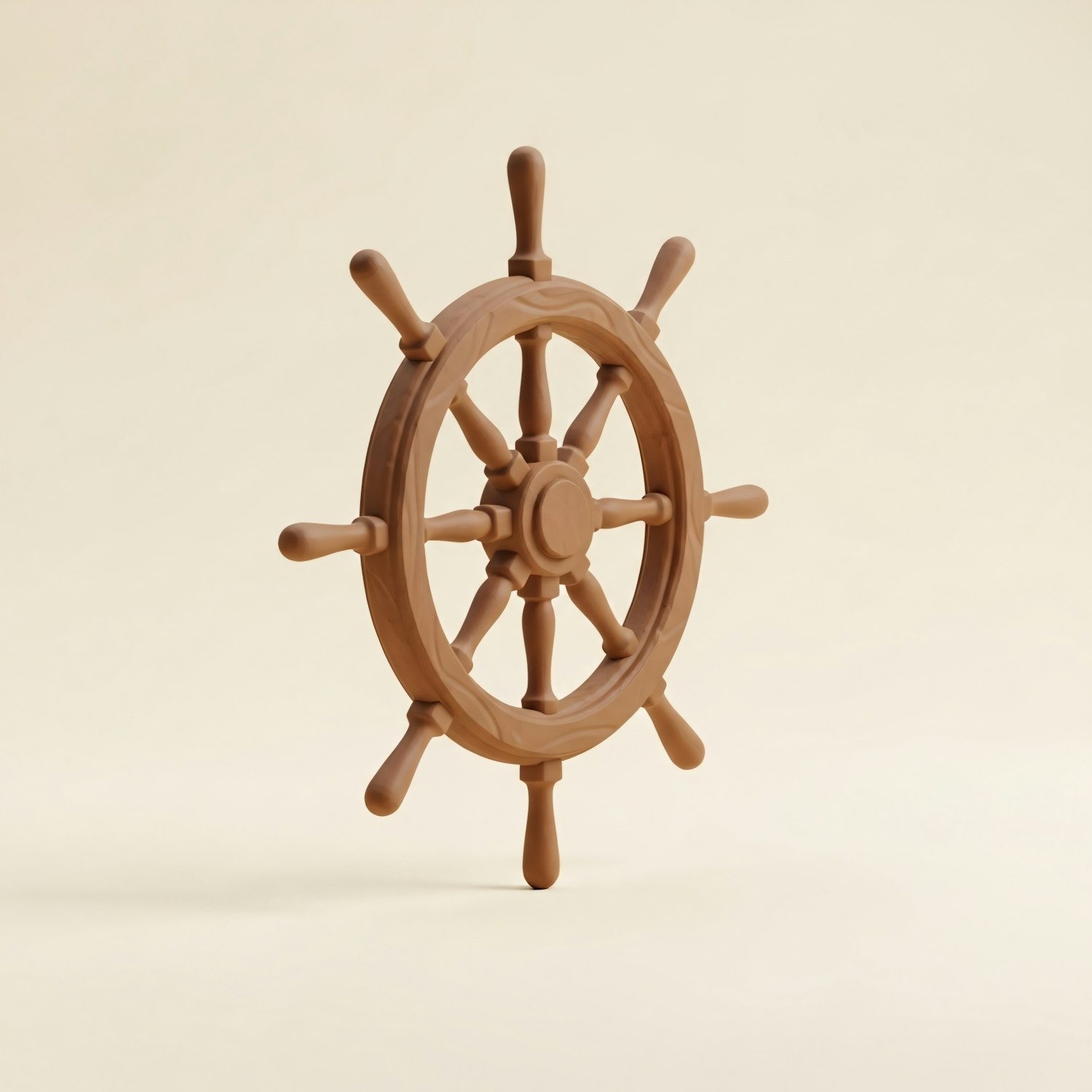 A wooden ship's wheel with a smooth finish and natural grain texture, set against a plain beige background, showcasing its craftsmanship.