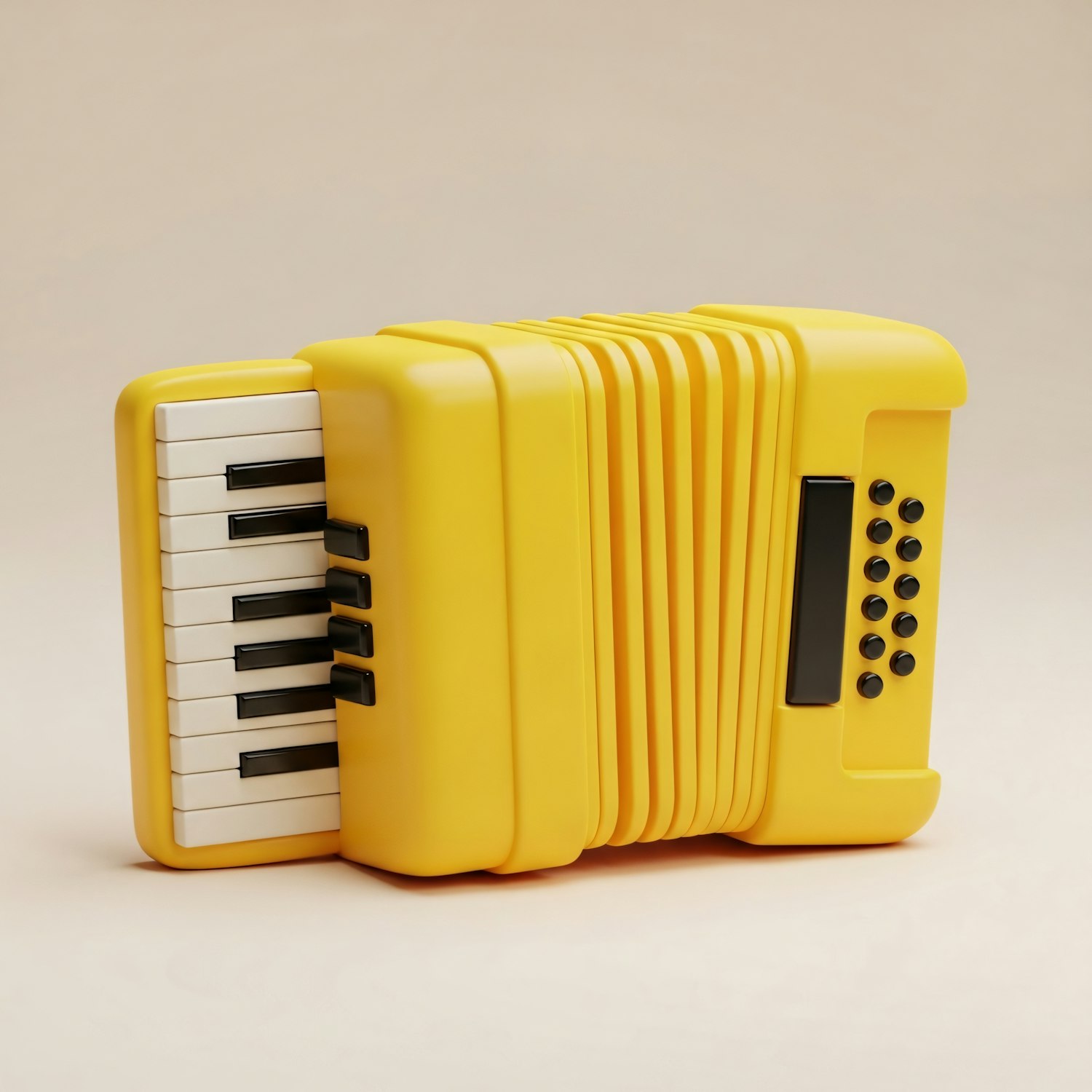 A vibrant yellow accordion with a modern design, featuring black and white keys and buttons, set against a neutral background.