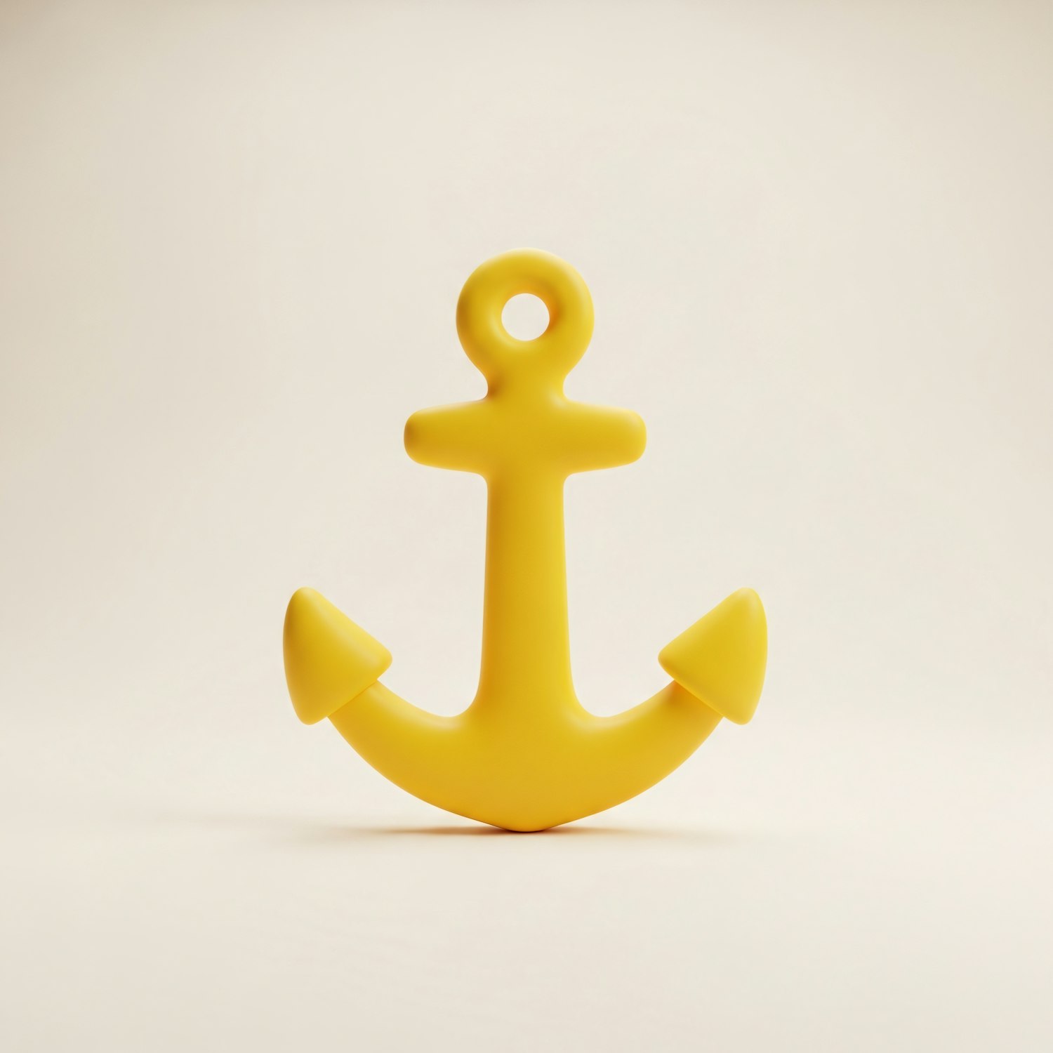 A bright yellow anchor-shaped object with a smooth design, set against a neutral beige background, creating a striking visual contrast.