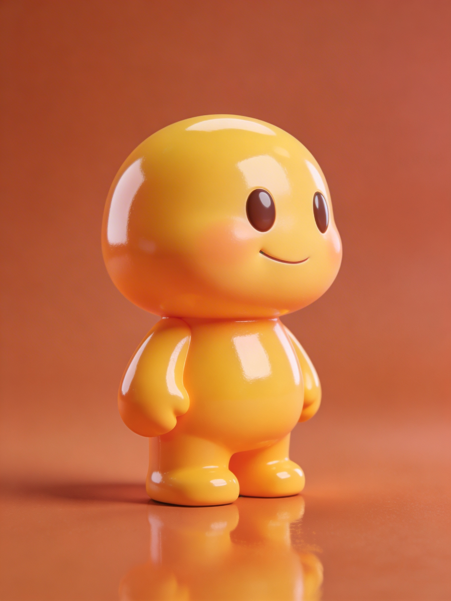 A glossy yellow cartoon figurine with a cheerful smile stands against a warm orange background, creating a vibrant and playful scene.
