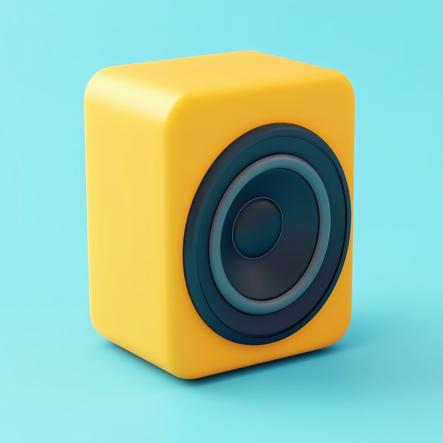 Bright yellow cube-shaped speaker with a black circular cone on a light blue background, showcasing a modern and playful design.