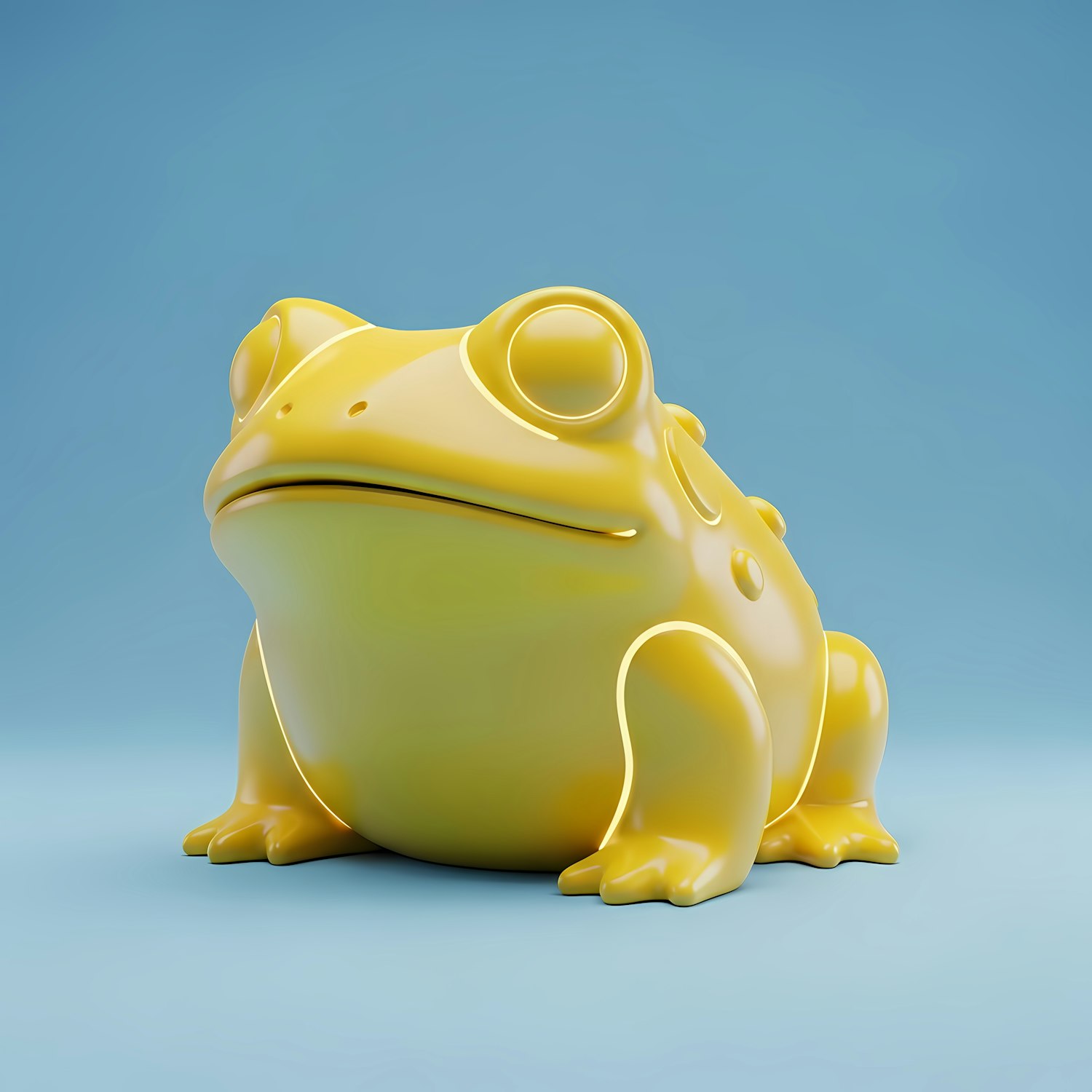 A vibrant yellow 3D-rendered frog with a glossy finish against a light blue background, showcasing a modern and stylized design.