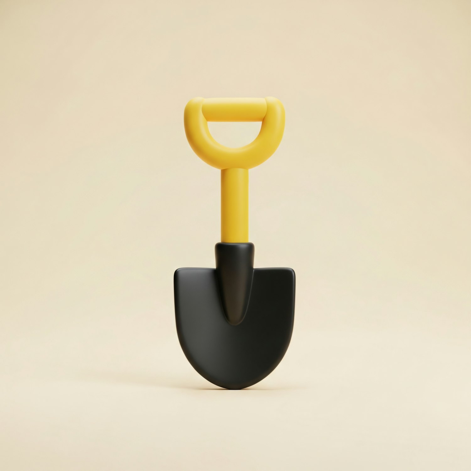 A small yellow and black plastic shovel against a beige background, showcasing its ergonomic design and bright colors.