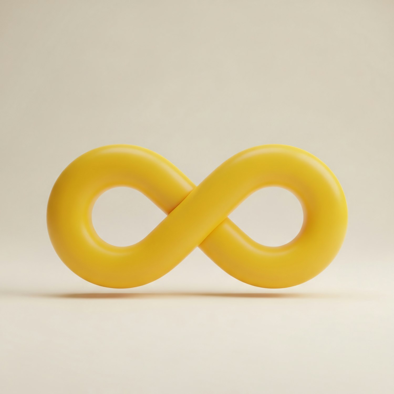 A glossy yellow infinity symbol on a neutral beige background, showcasing a clean and modern design with soft lighting.