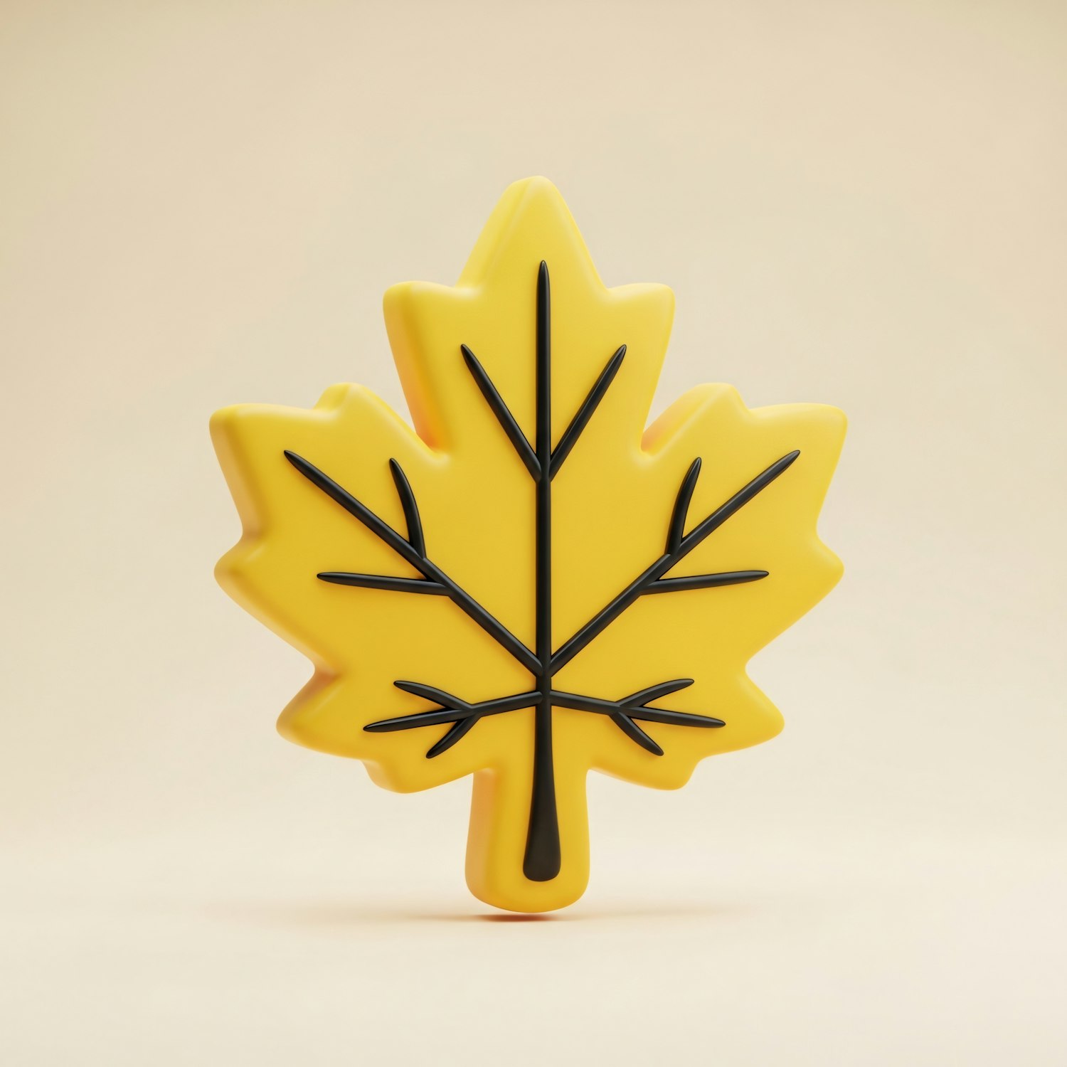 A bright yellow maple leaf with black veins on a soft beige background, showcasing a clean and modern design.