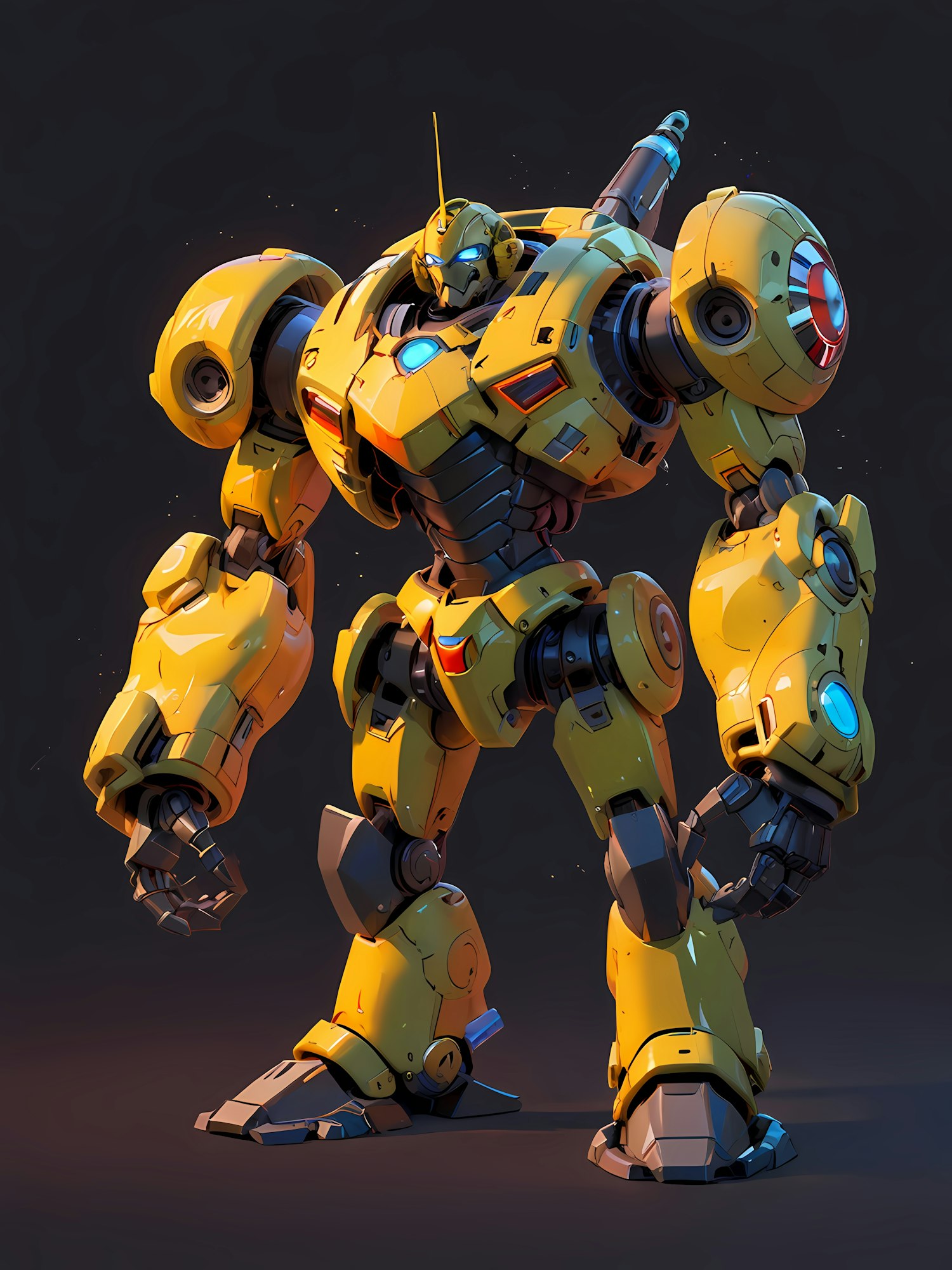 A futuristic yellow mech robot with glowing blue lights and intricate details, standing boldly against a dark background.