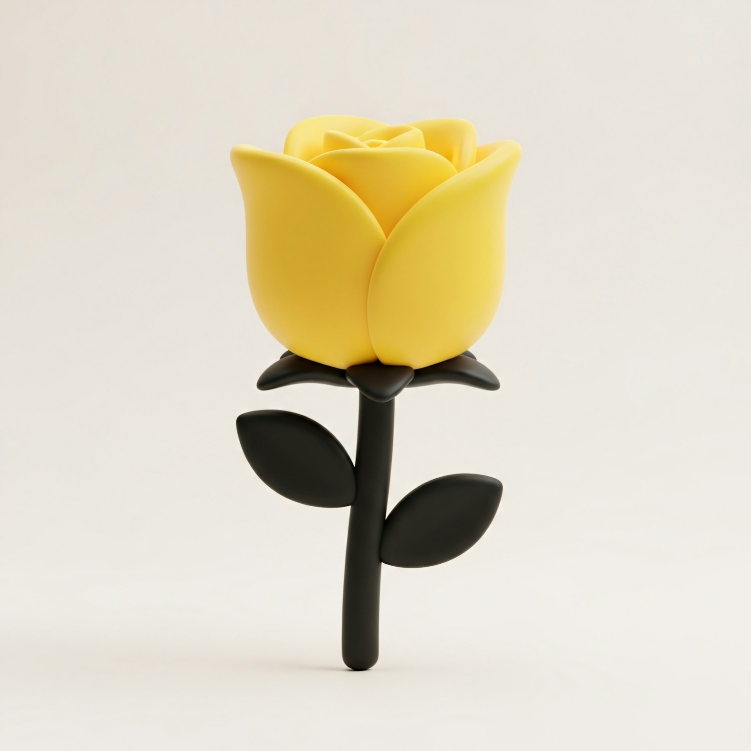 A 3D-rendered yellow rose with a black stem and leaves, showcasing a modern and minimalistic design on a neutral backdrop.