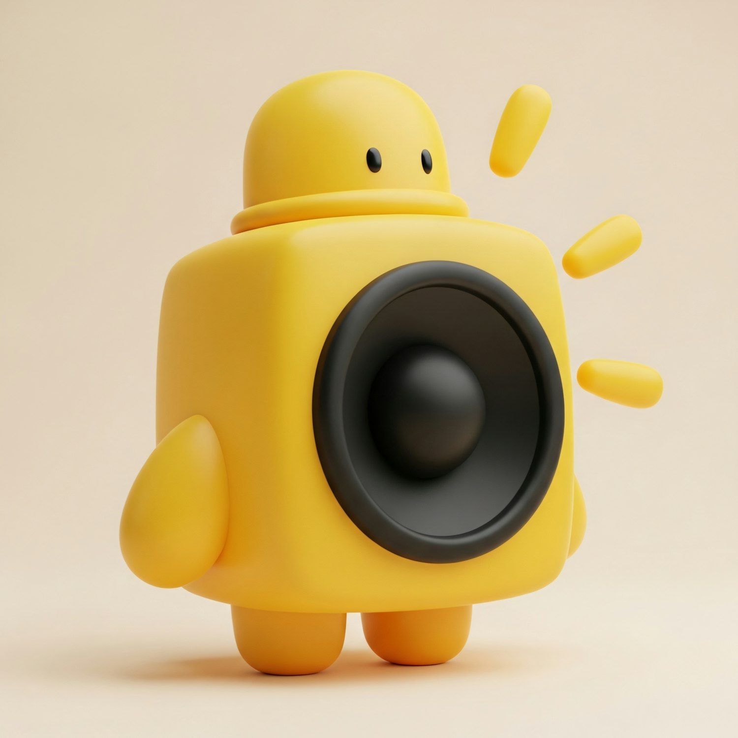A playful 3D-rendered yellow speaker character with a humanoid shape, featuring a large black speaker and a soft beige background.