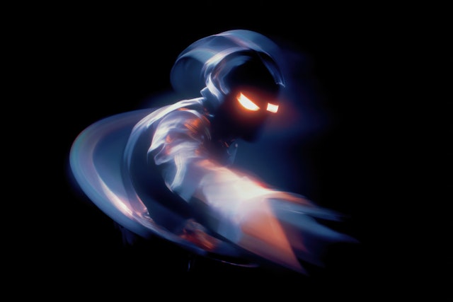 Futuristic abstract elements with digital textures, neon tones, and depth.