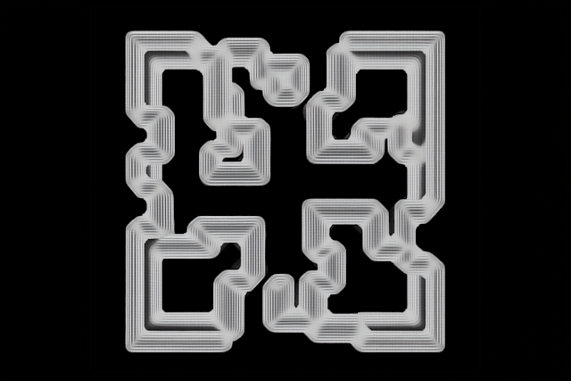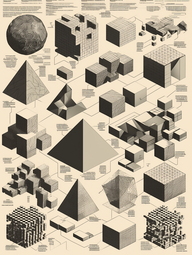 Geometric forms creating dynamic visual patterns and dimensional illusions.