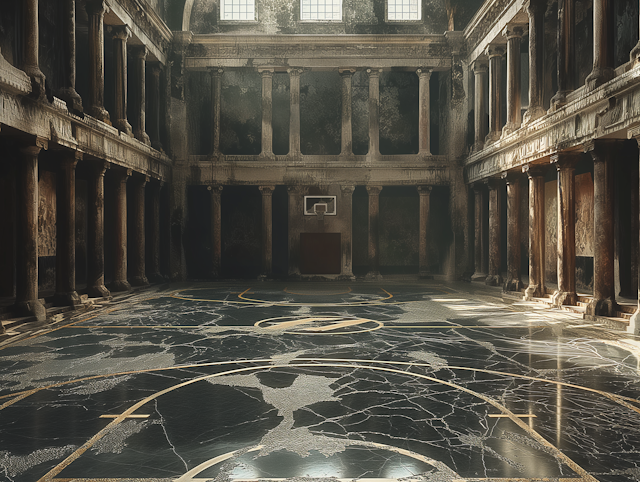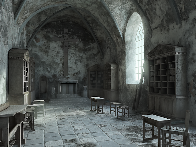 Medieval interiors with stone walls, wooden beams, and historical motifs.