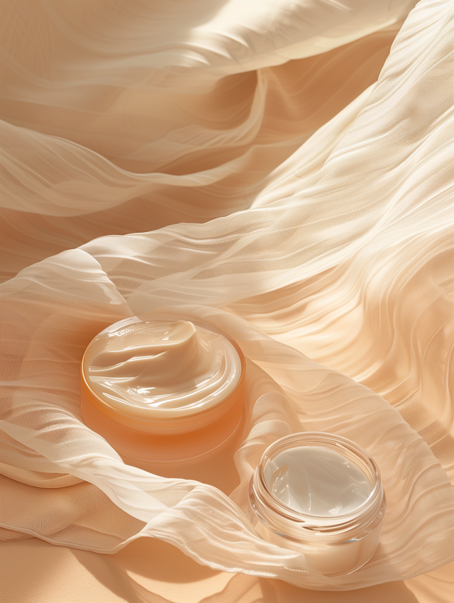 Soothing beauty cream textures captured in smooth swirls, dollops, and soft-focus jars.