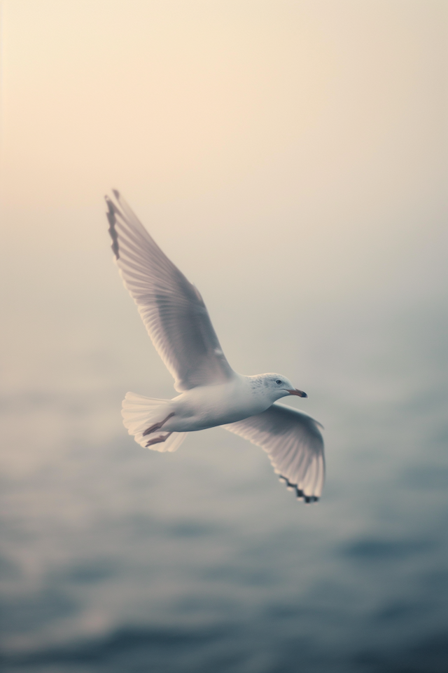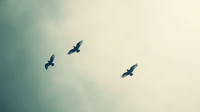 Birds in flight with wings spread wide and sky backgrounds.