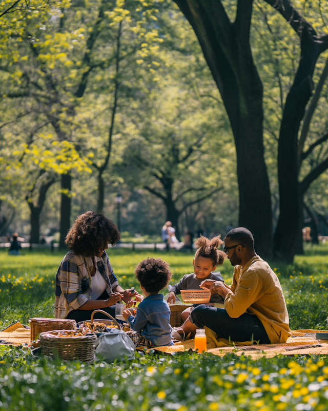 Cheerful family picnic moments under sunny skies with blankets and baskets of food.