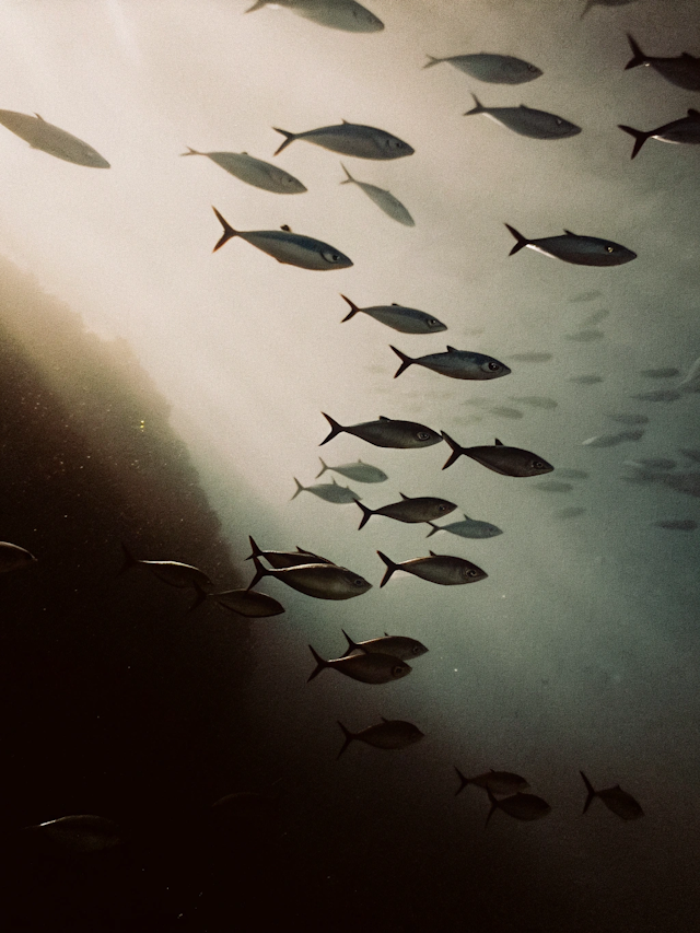 Schools of fish swimming in unison—dynamic and fluid motion.