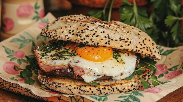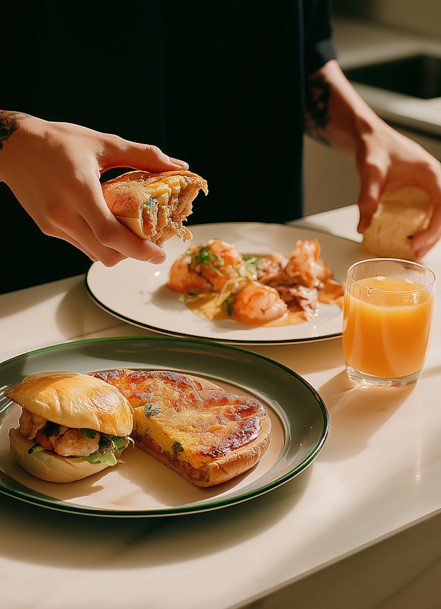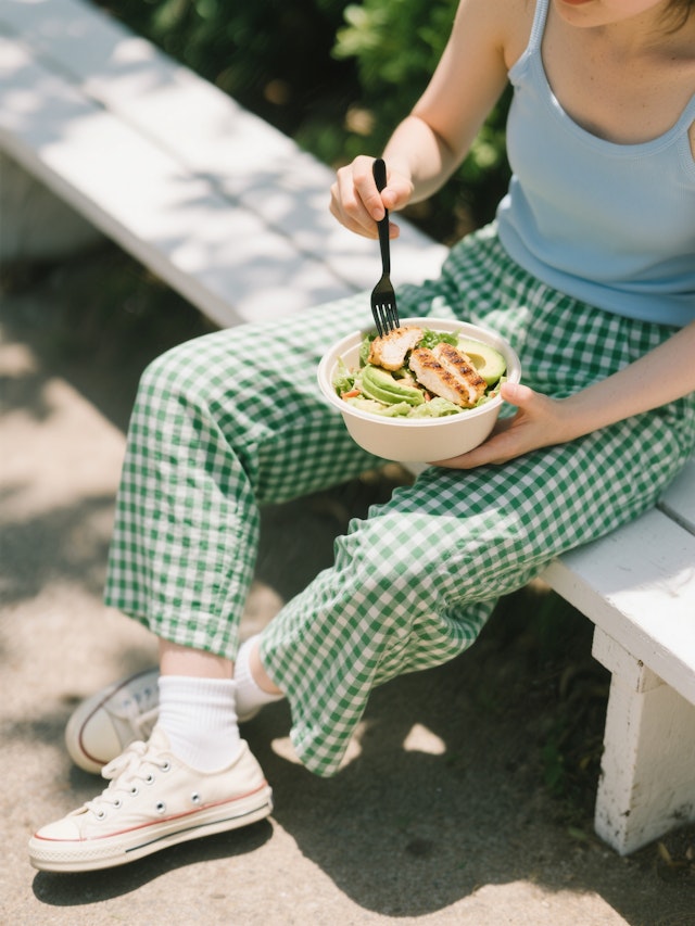 Classic lunch moments with sandwiches, salads, or power bowls in daylight settings.