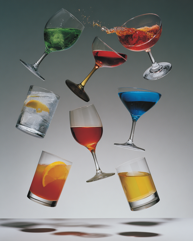 Barware including cocktail glasses, whiskey tumblers, and decanters.