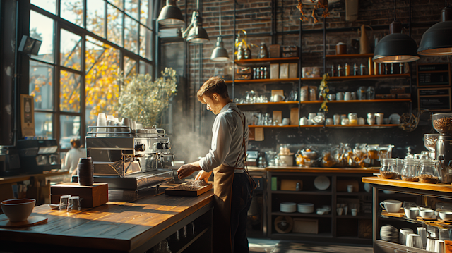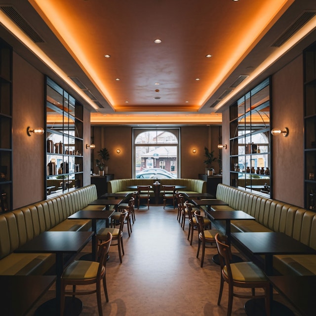 Cozy cafe interiors with warm lighting, artisan decor, and inviting seating arrangements.