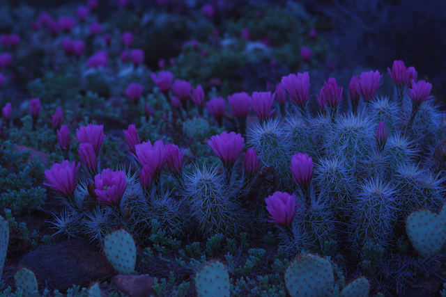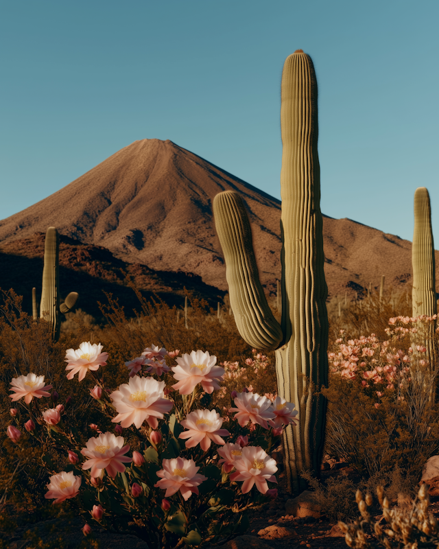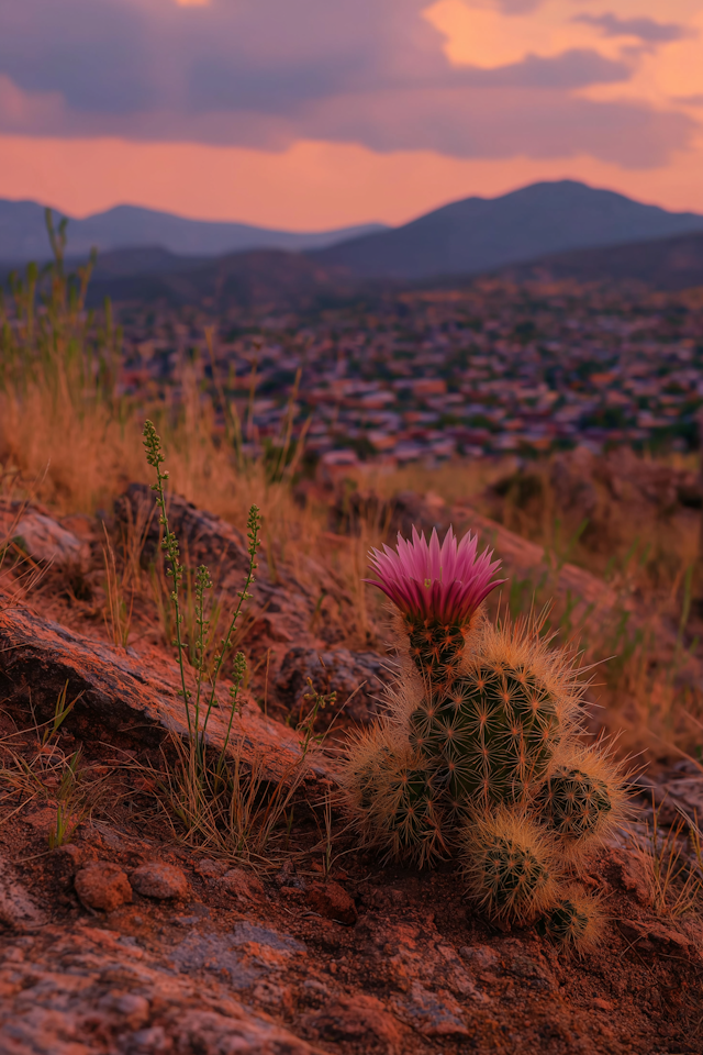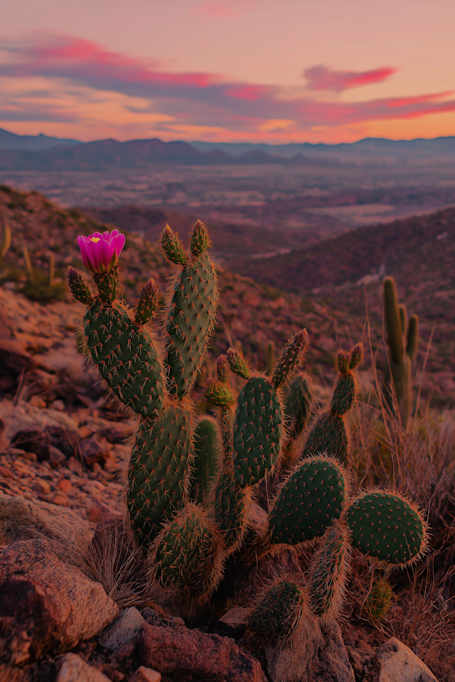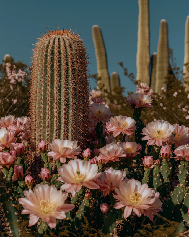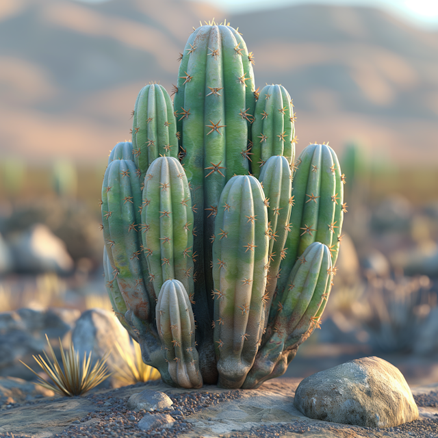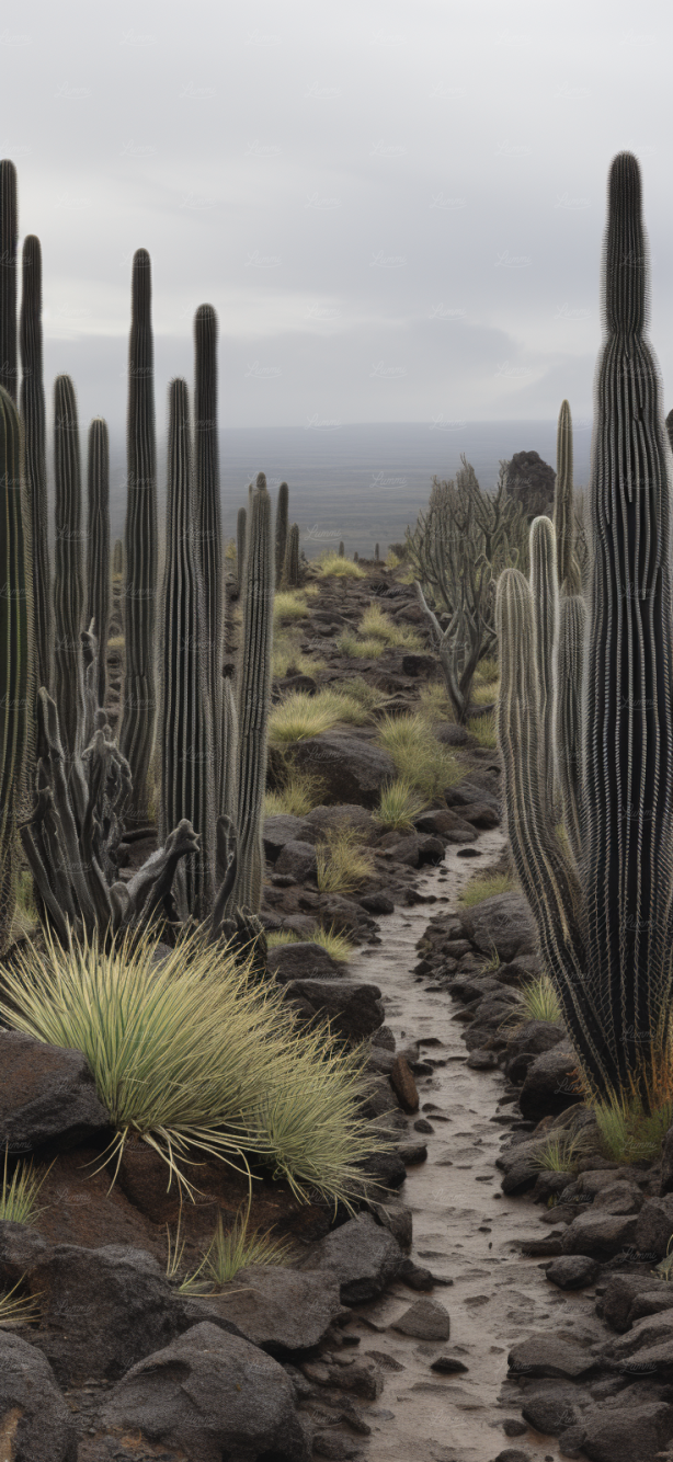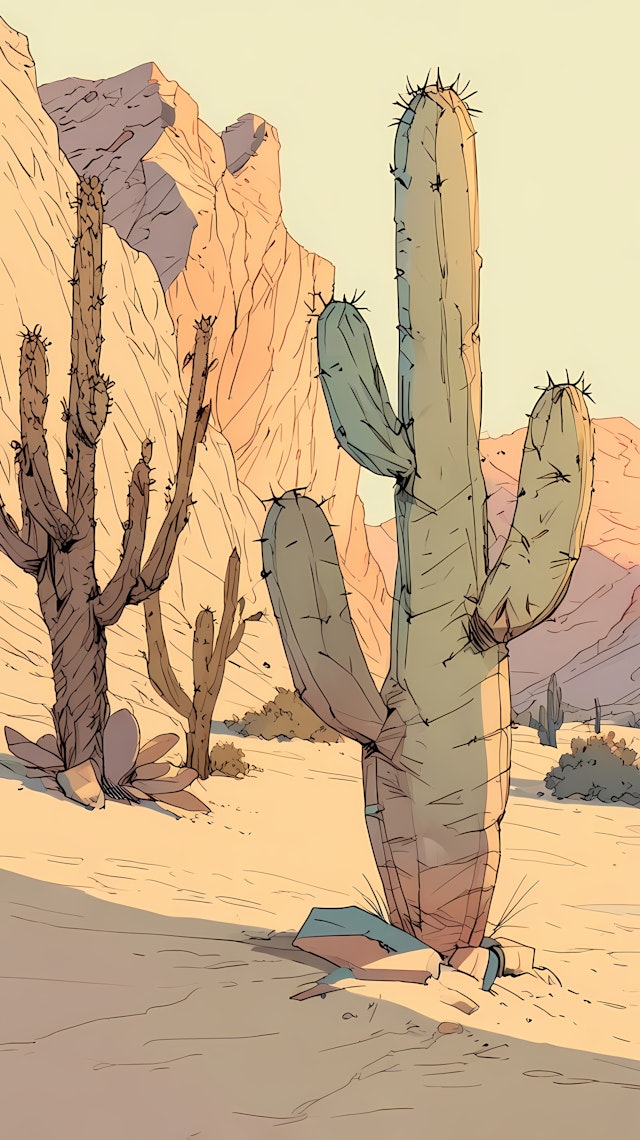 Rugged cactus landscapes from arid regions, showcasing spiky silhouettes and sandy soil.