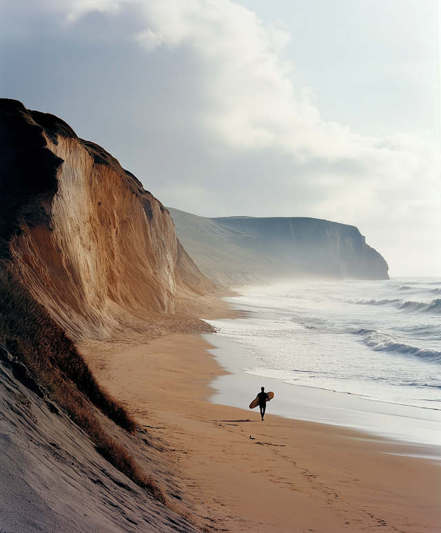 Solo surfers catching waves or walking alone along sandy shores.