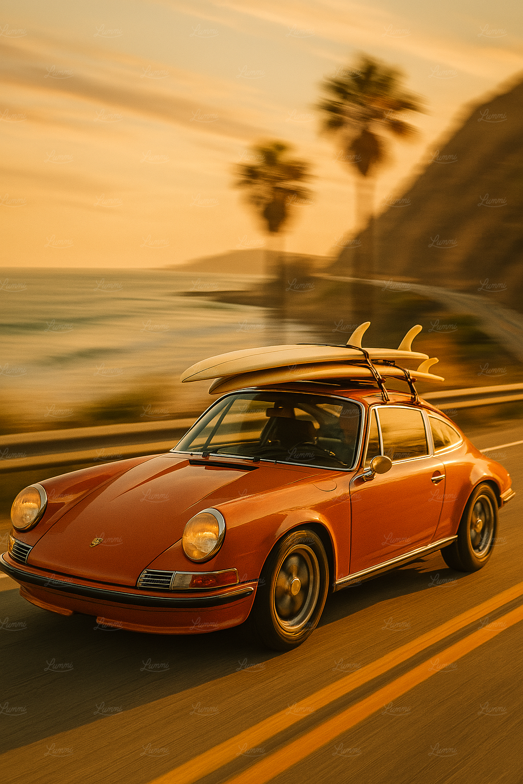 Sunset surf scenes with silhouettes and warm hues reflecting on water.