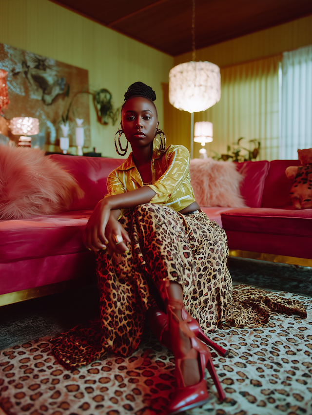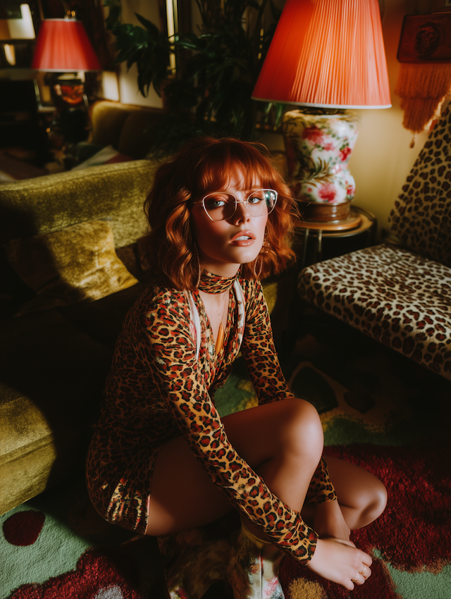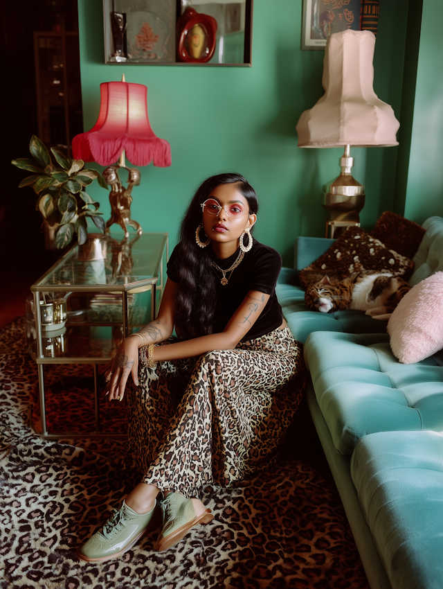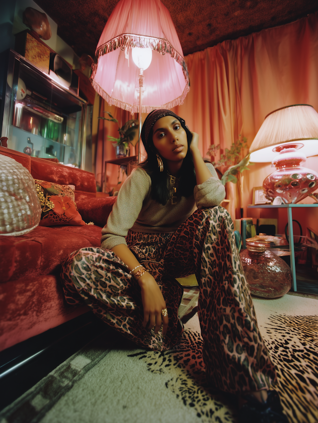 A retro-inspired fashion photo series featuring models in vibrant 70s-inspired decor with rich colors, leopard print textiles, vintage lamps with fringed shades, classic Vespa scooters, and bold fashion combining animal prints with saturated hues.
