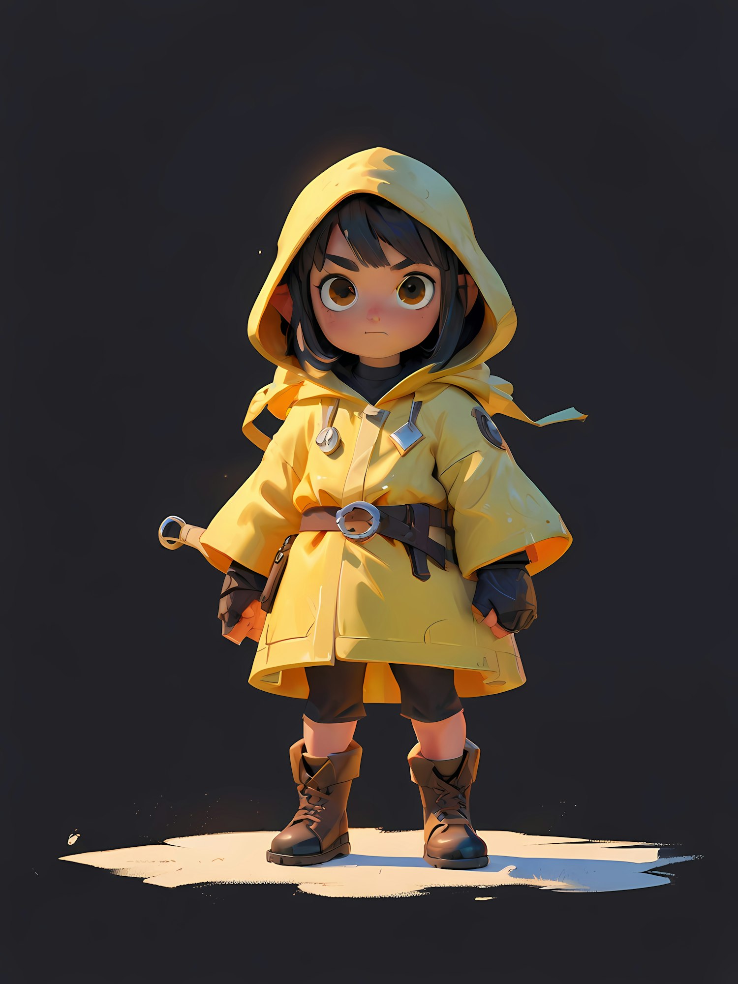 Stylized 3D character in a yellow raincoat with a determined look, set against a dark background. Perfect for adventure or fantasy themes.