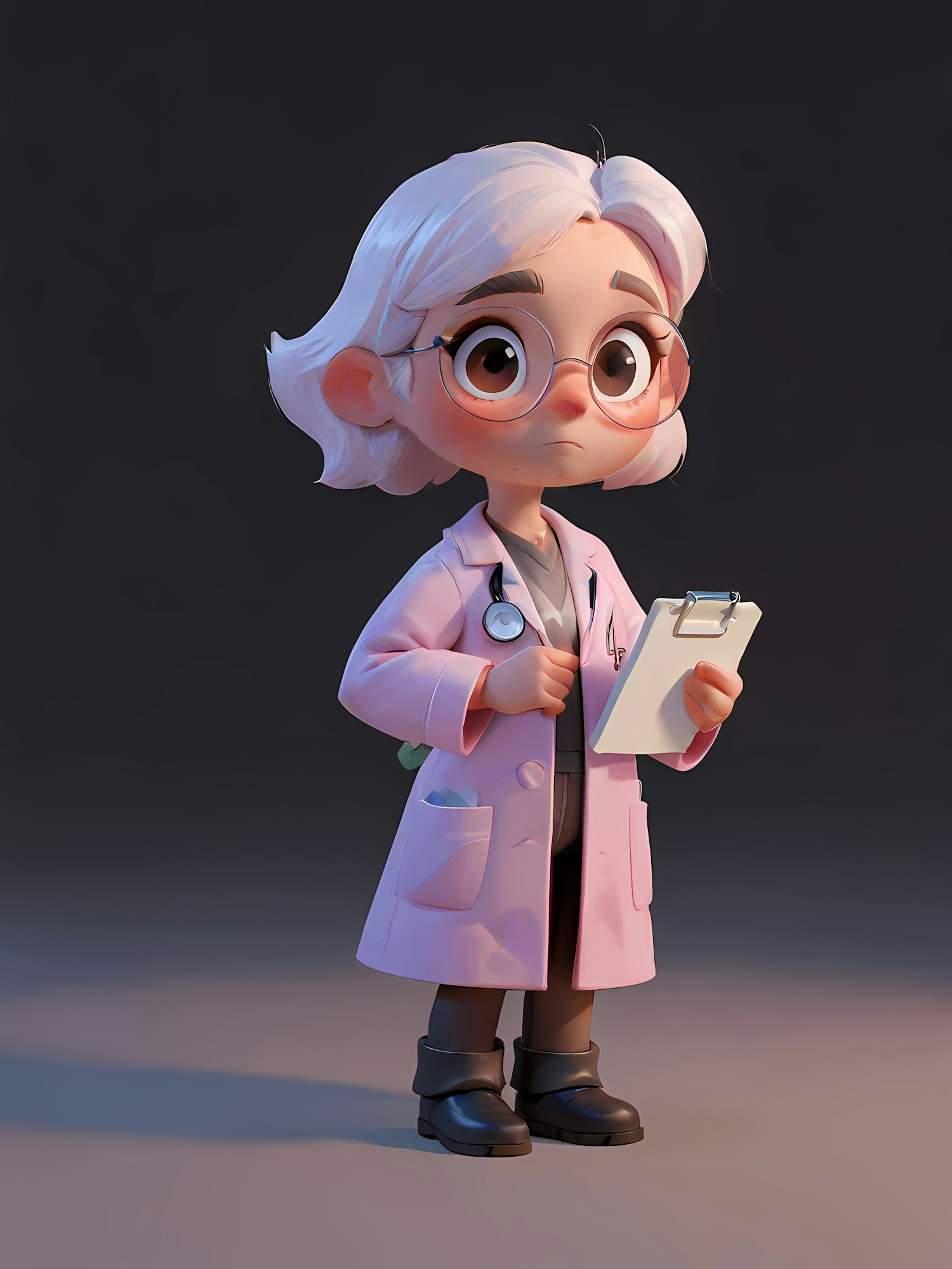 Adorable 3D illustration of a young female doctor in a pink lab coat, holding a clipboard with a stethoscope around her neck.