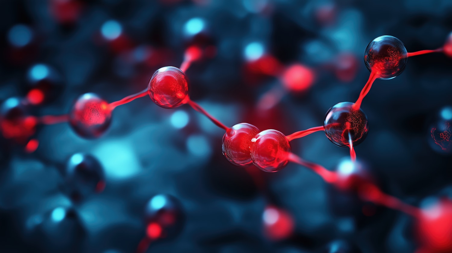A vibrant 3D molecular structure with glowing red atoms and bonds against a deep blue background, showcasing scientific elegance.