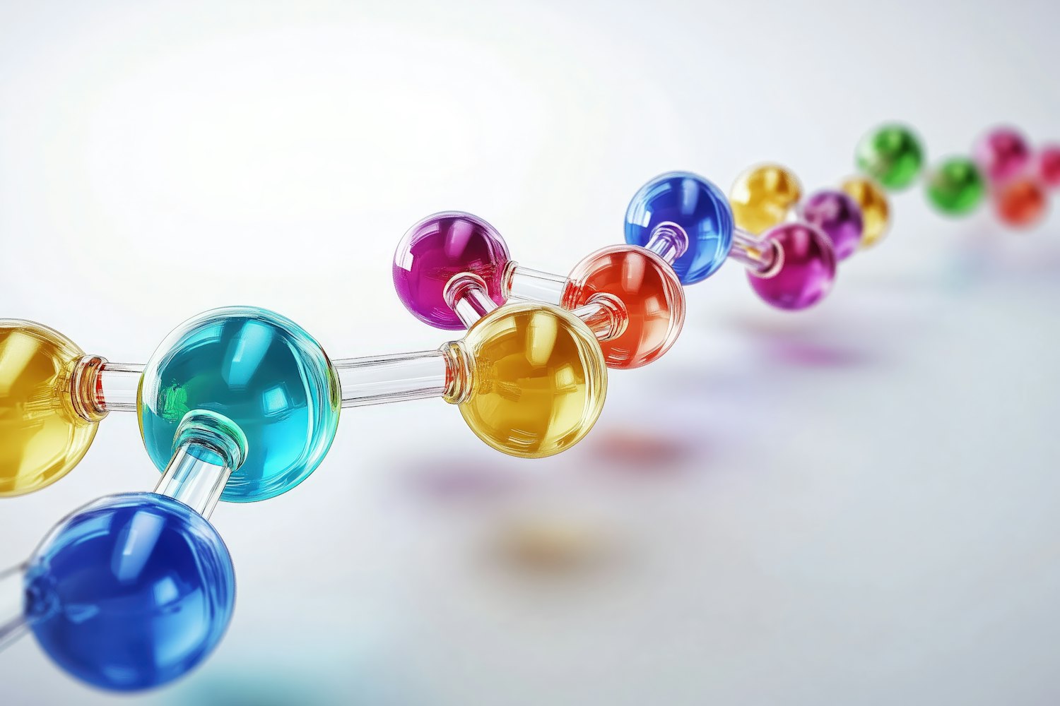 Colorful 3D molecular structure with vibrant spheres connected by transparent rods, set against a soft gradient background.