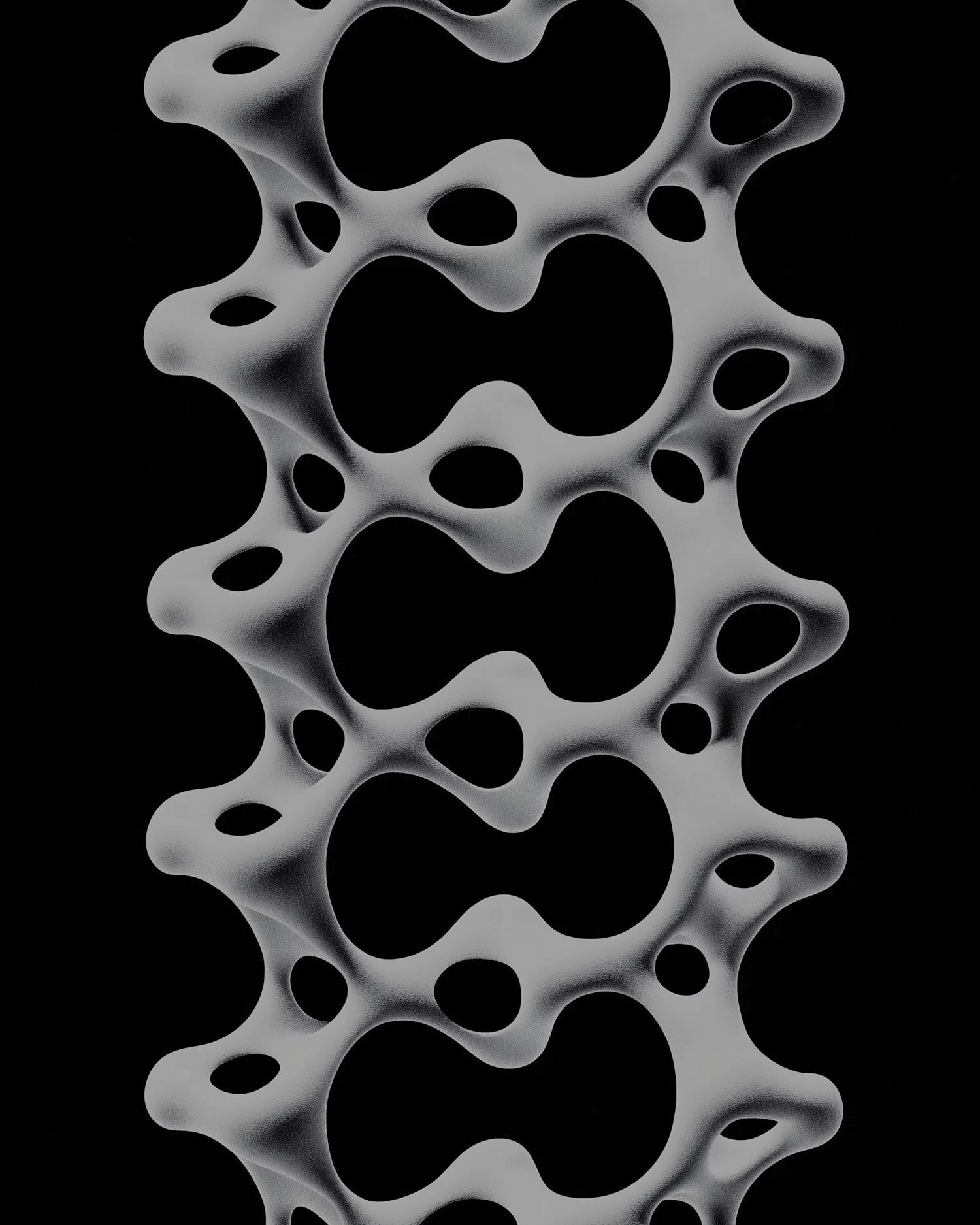 Abstract 3D lattice structure with smooth, porous design in gray tones against a black background, evoking a futuristic aesthetic.