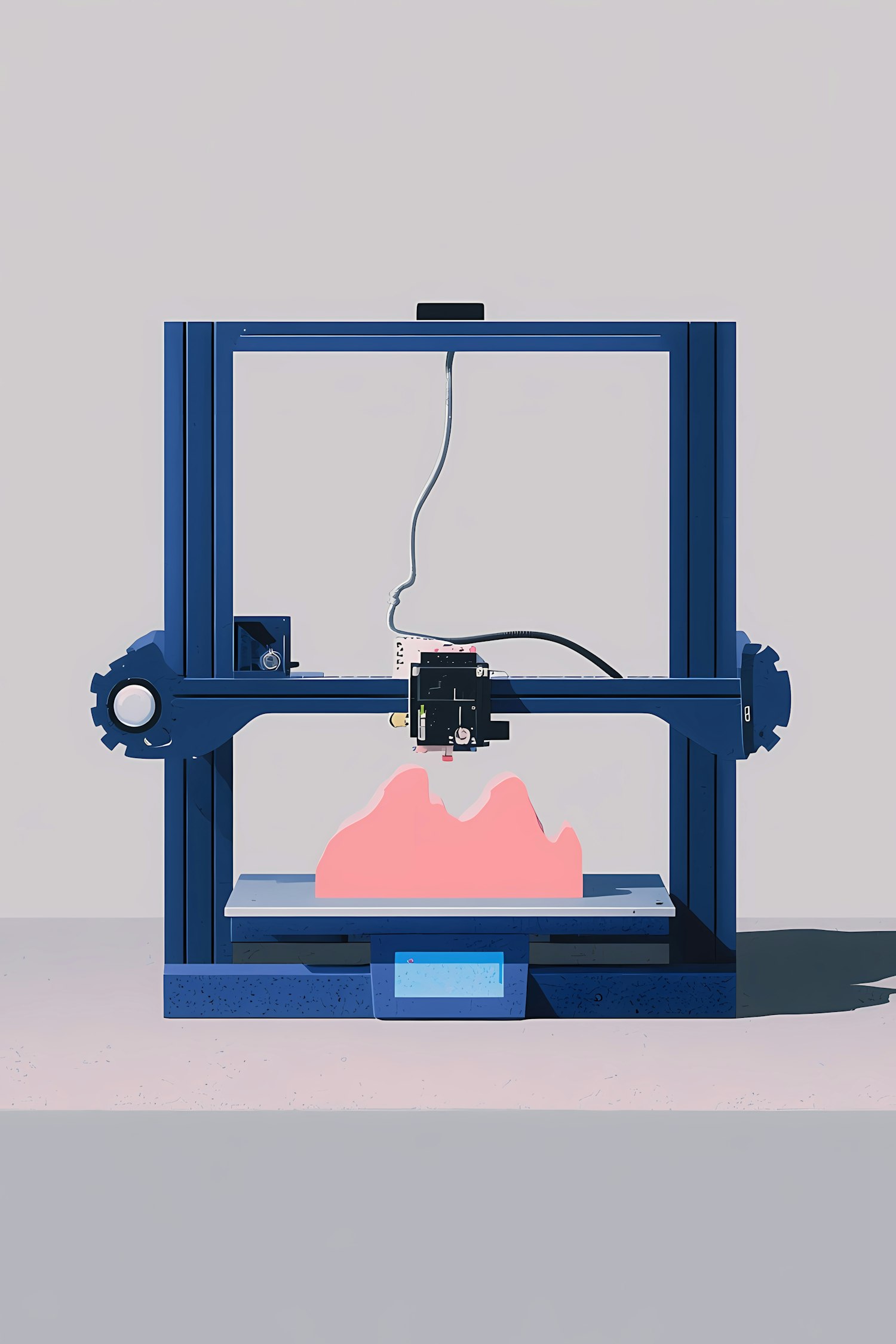 Stylized illustration of a 3D printer creating a pink object, showcasing its mechanical details against a minimalistic background.