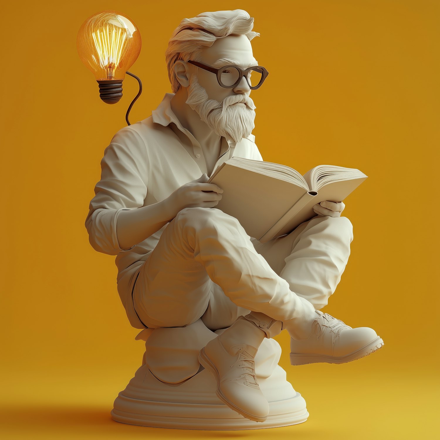 3D sculpture of a man reading a book with a glowing light bulb near his head, set against a vibrant yellow background.