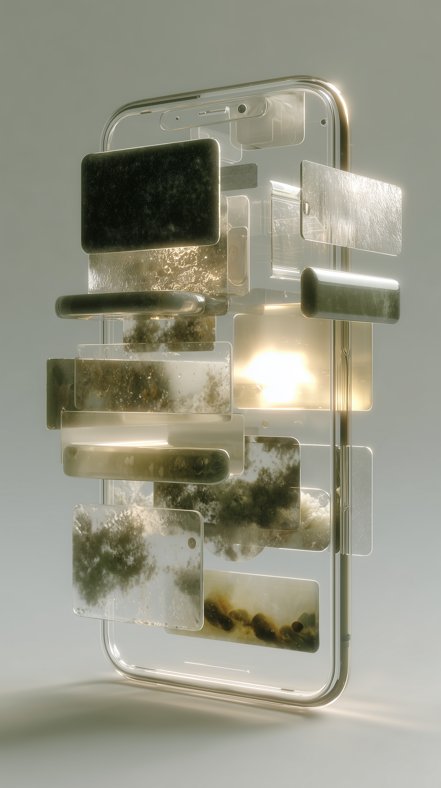 A 3D-rendered smartphone with floating translucent panels showcasing abstract textures and light effects, creating a futuristic aesthetic.