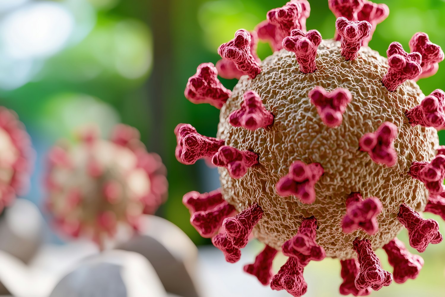Detailed 3D rendering of a virus particle with red spikes and a textured beige surface, set against a blurred green background.