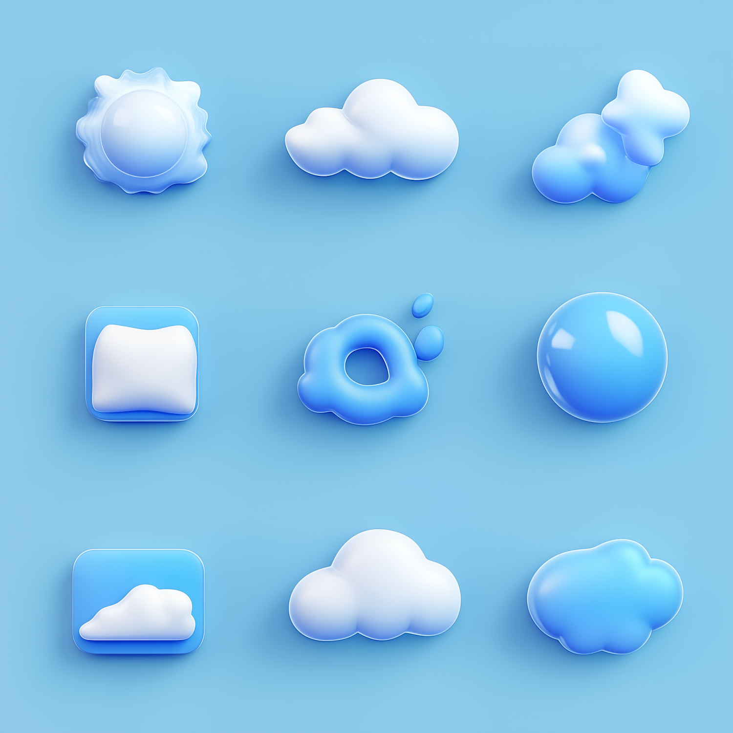Playful 3D weather icons with clouds, sun, and abstract shapes in white and blue hues on a light blue background. Perfect for modern designs.