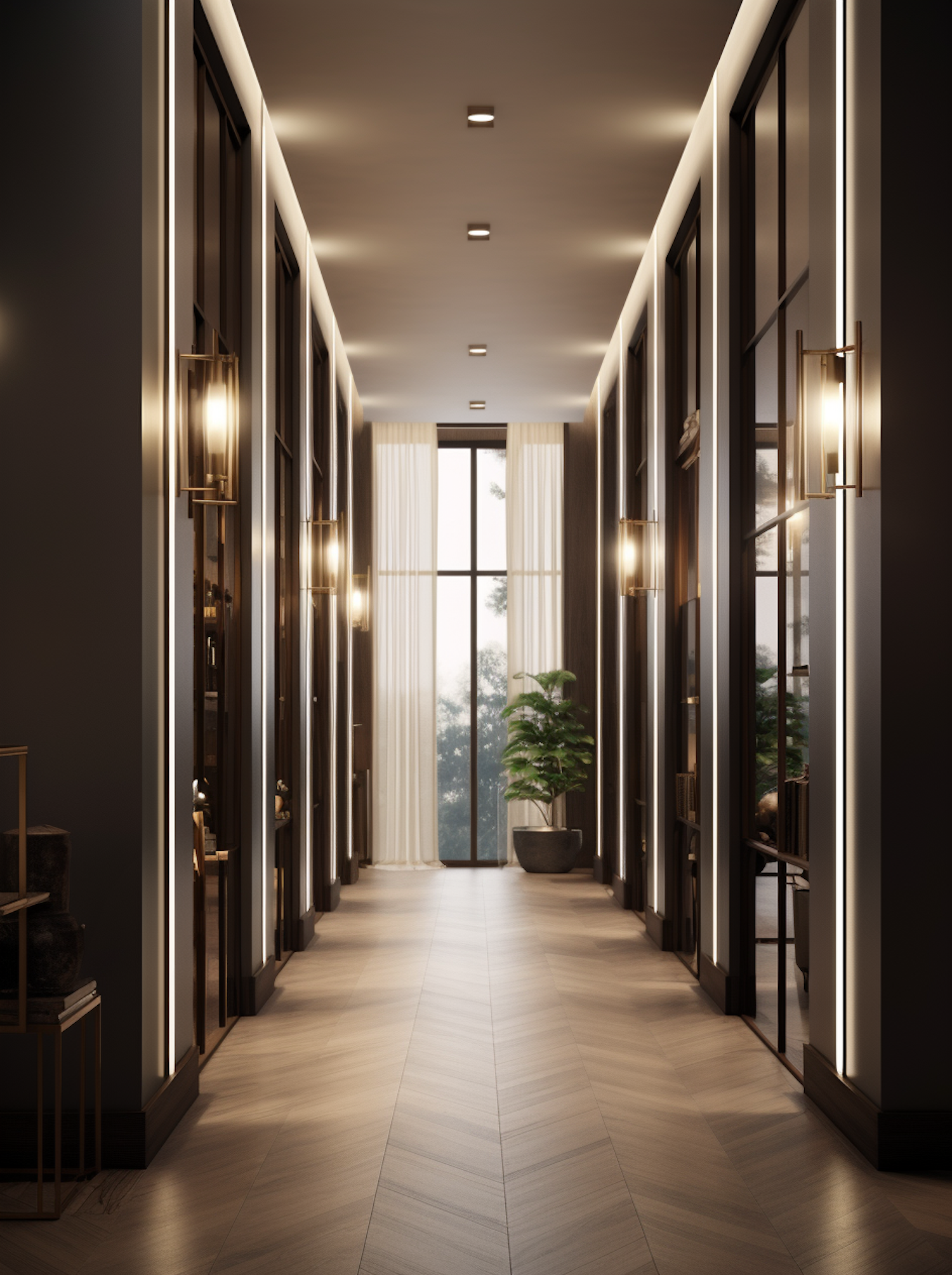 Elegant hallway with herringbone wood floor, mirrored walls, warm lighting, and a large window with sheer curtains and a potted plant.
