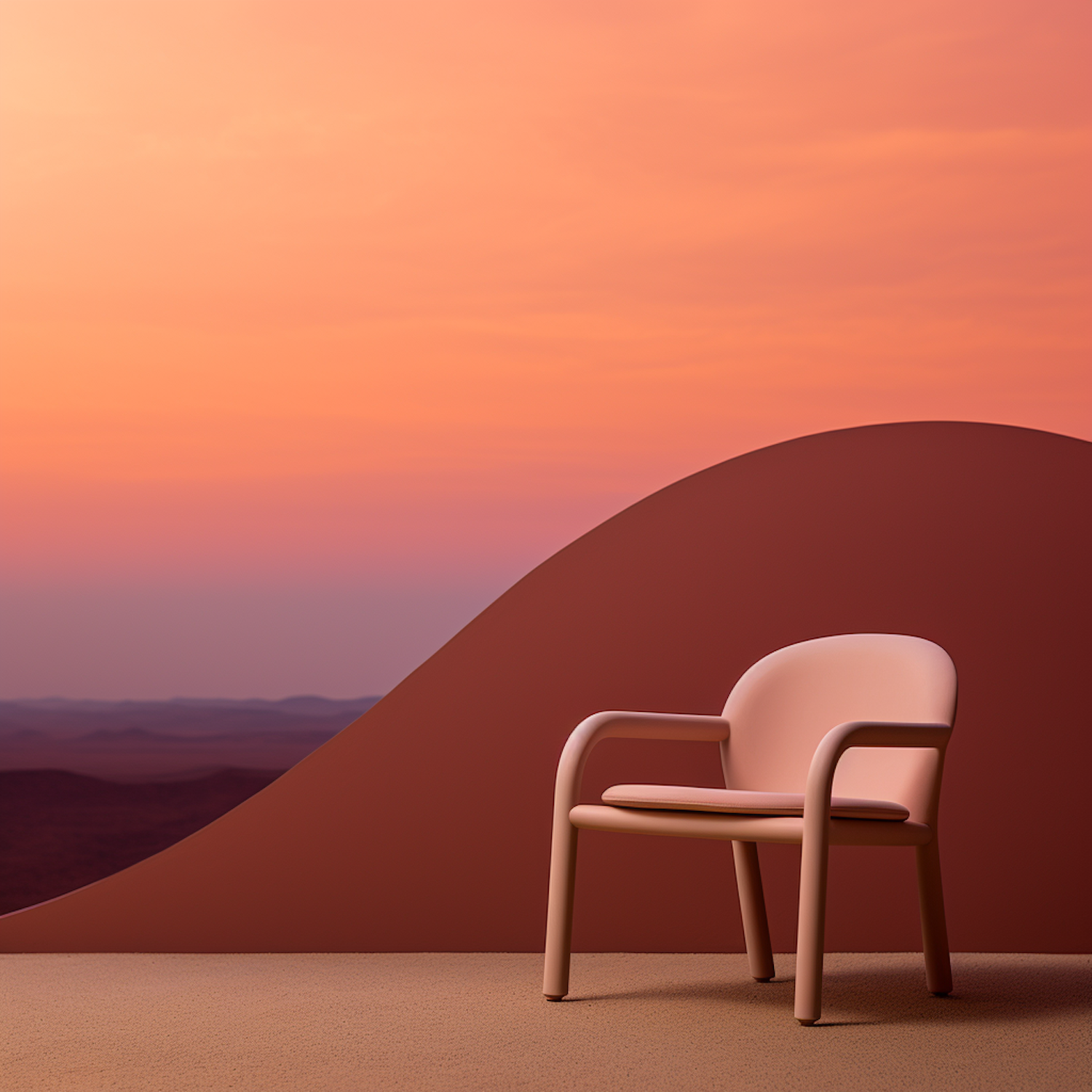 Modern chair against a warm gradient sky, featuring minimalist design and soft colors, creating a serene and balanced composition.